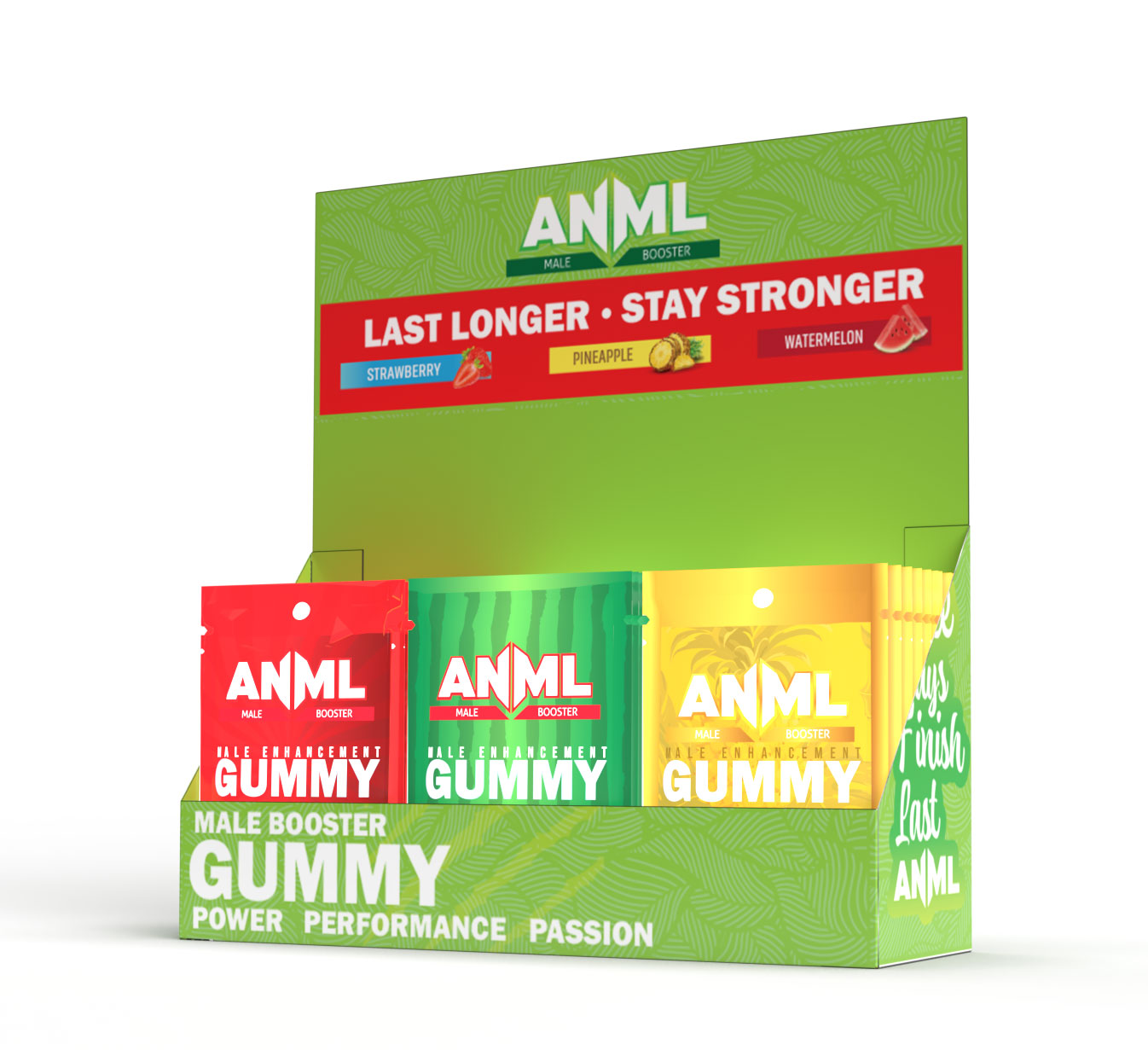 Experience the power of ANML Male Enhancement Gummies, your go-to solution for enhanced performance and vitality. Each pack features a single gummy, perfectly dosed to deliver effective results without the risk of headaches or unpleasant aftertastes. Our gummies come in three delicious flavors—juicy watermelon, fresh strawberry , and refreshing pineapple—making every bite a treat for your taste buds.